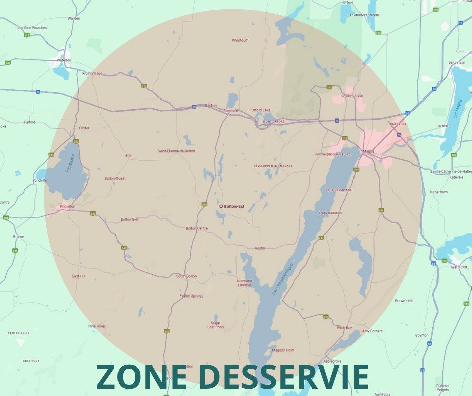 Basée à Bolton-Est, je me déplace dans toute la région environnante : Magog, Eastman, Orford, Austin, Stukely, Saint-Étienne-de-Bolton, et bien d’autres.